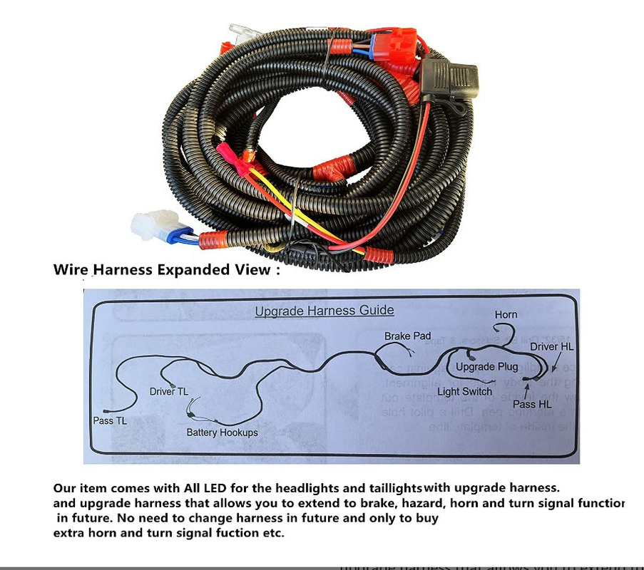 | Includes | Halogen Headlight, LED Taillight, Harness, Turn Indicator, Brake Switch, Horn, Column Cover, Template, Full Color Installation Instruction, Nylon Ties and Hard wares |